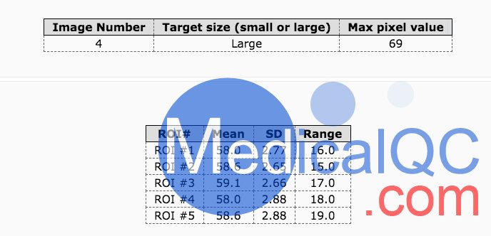 上圖顯示了 5 個(gè)感興趣區(qū)域,下圖是 Smári 報(bào)告。 除此信息外,Smári 報(bào)告還提供了一份基于 Catphan® 700 圖像測量結(jié)果的綜合報(bào)告。